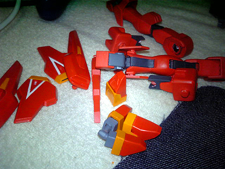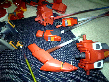 基本塗装である機体色の赤をやっと終塗りわり、関節や羽などスプレー缶作業はトップコートだけになりました。